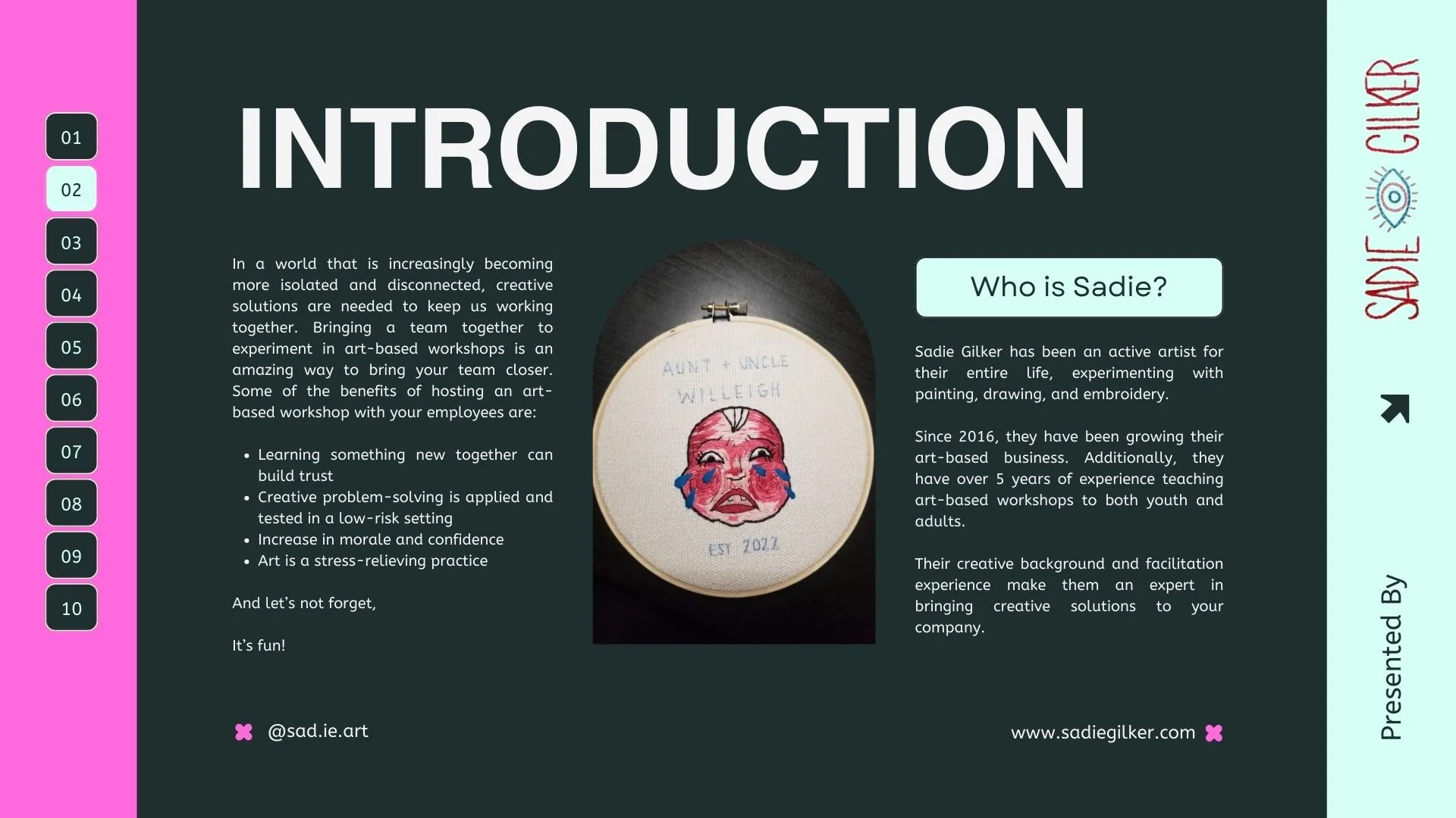 Sadie is well versed in creating one-off and multi-session workhops on topics based on Civic Education, Art, Activism, and Social Planning. Their background in Urban Planning, as well as Facilitation in non-profits and institutional think-tanks has eqipped them to design a workshop that is perfect for you and your group.